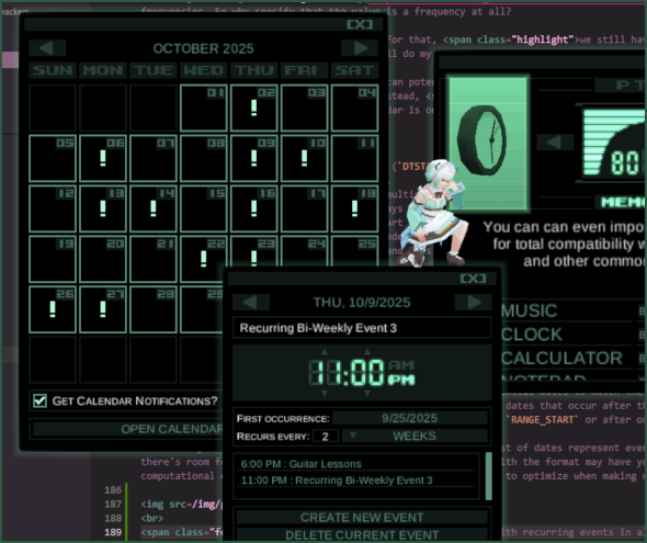 And there you have it! The resulting list of dates represent every occurrence of the event within the desired range. I'm sure there's room for optimization, but despite what all this work with the format may have you thinking, we're not actually in the '90s any more! We can afford the computational overhead (but I will continue to think about ways to optimize when making updates).